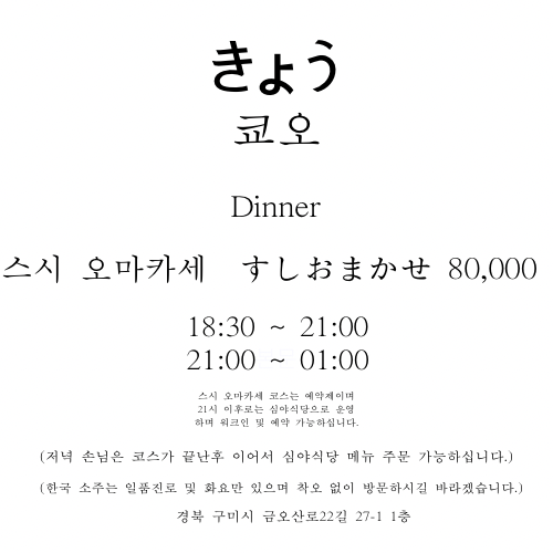 너무 인상깊었고 좋은 기억들로 가득해서 꼭! 공유하고 싶었답니다.제가 방문한 오마카세는 「쿄오」라는 곳이고